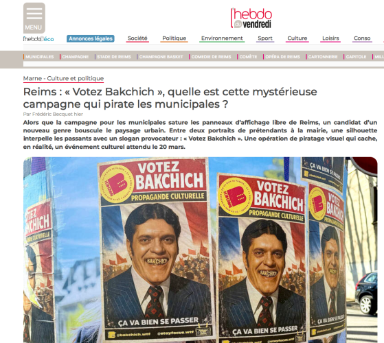 Lire l’article : https://www.lhebdoduvendredi.com/article/55413/reims-votez-bakchich-quelle-est-cette-mysterieuse-campagne-qui-pirate-les-municipales Release party de Bakchich n°2, le 20 mars, à l’hôtel Mercure de Reims à partir de…