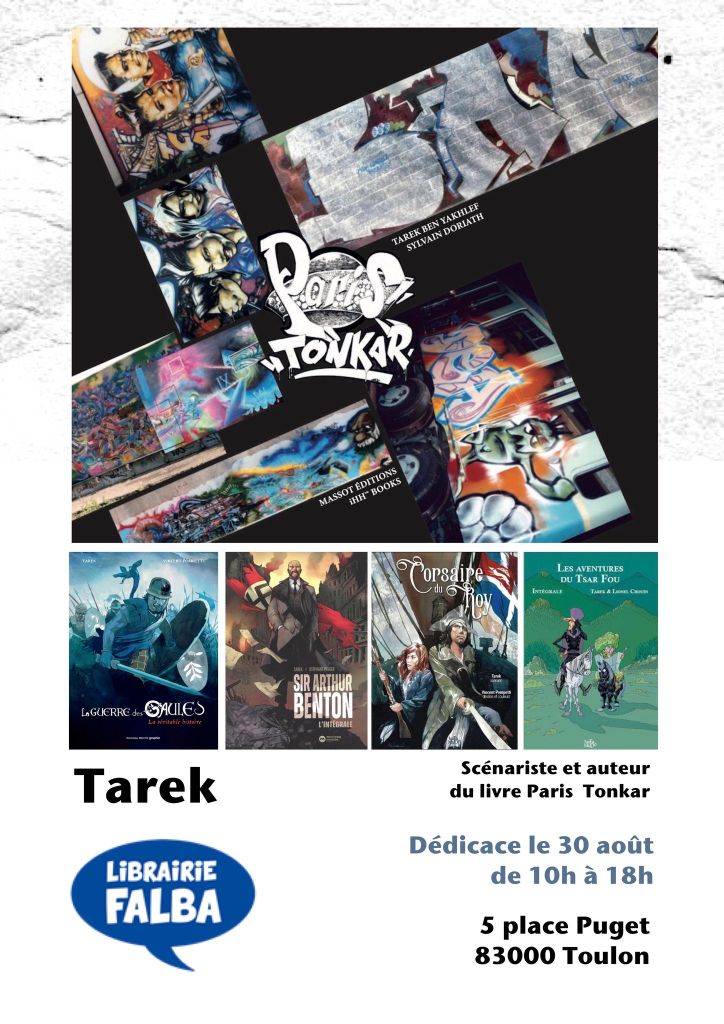 La première séance de dédicaces de Paris Tonkar aura lieu à Toulon à la librairie Falba. Tarek sera présent pour y présenter également ses bandes dessinées.